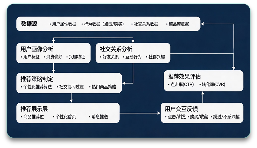 通过分析用户的社交关系和行为数据,为用户推荐可能感兴趣的商品或好友,从而提升用户的社交体验和平台的活跃度。