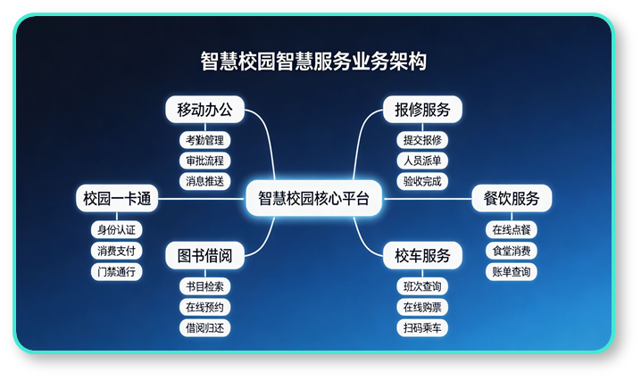 围绕师生日常生活需求,整合一卡通、移动办公、报修等核心场景,构建全方位、人性化的智慧生活服务体系,提升校园生活体验。