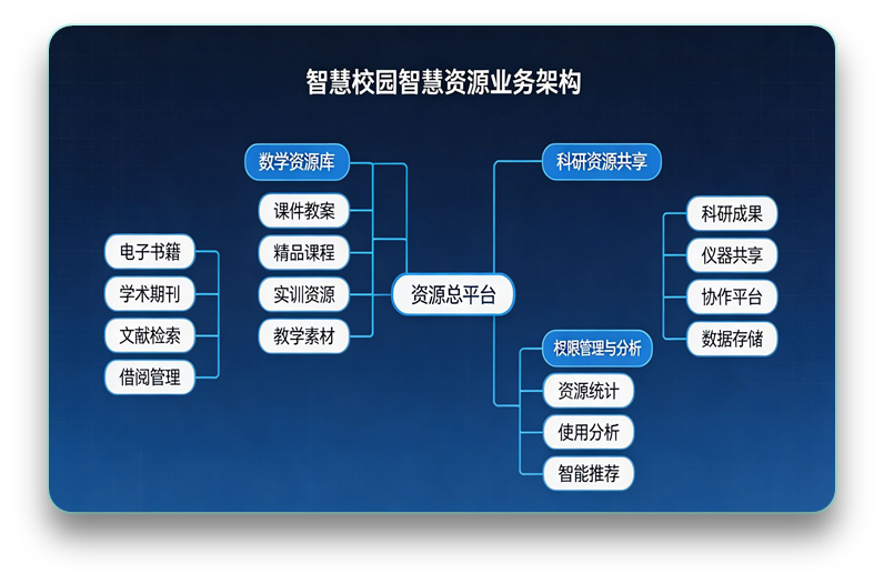 智慧资源整合了数字图书馆、教学资源库、科研资源等各类校园资源,通过智能化的管理和共享平台,实现资源的高效利用和便捷获取,为教学和科研提供有力支持。